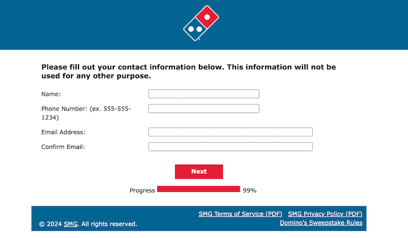 To enter without completing a Survey, print your name, address, phone number, email address, and date of birth on a piece of paper and mail it in an envelope with proper postage to “Domino’s Voice of the Customer Survey Sweepstakes” c/o Merkle Inc., P.O. Box 5022, Department 860981, Kalamazoo, MI 49003-5022. You will receive one entry into the drawing.
